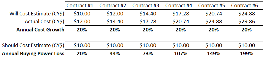 Cost growth reported by the DOD doesn’t seem too worrisome. But let’s say the next contract/program is based on realistic cost estimates from historical data [programs are funded to independent will-cost estimates]. 20% cost growth on my last contract will set the new, higher, baseline for my next contract. 20% cost growth again returns compounding growth on what the contract/program should have cost. So constant growth growth to “realistic” will-cost estimates actually means performance is deteriorating at an accelerating rate.
