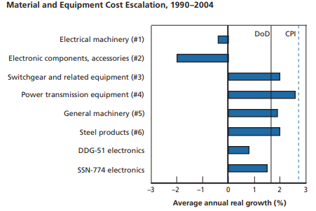 Material escalation is shown here is from the BLS Producer’s Price Index, not their specific measurements for Navy contractors. These are all growing less than the CPI (not the most relevant benchmark, but good enough). RAND found that contractor Labor and Material escalation doesn’t seem to have been too big a factor.